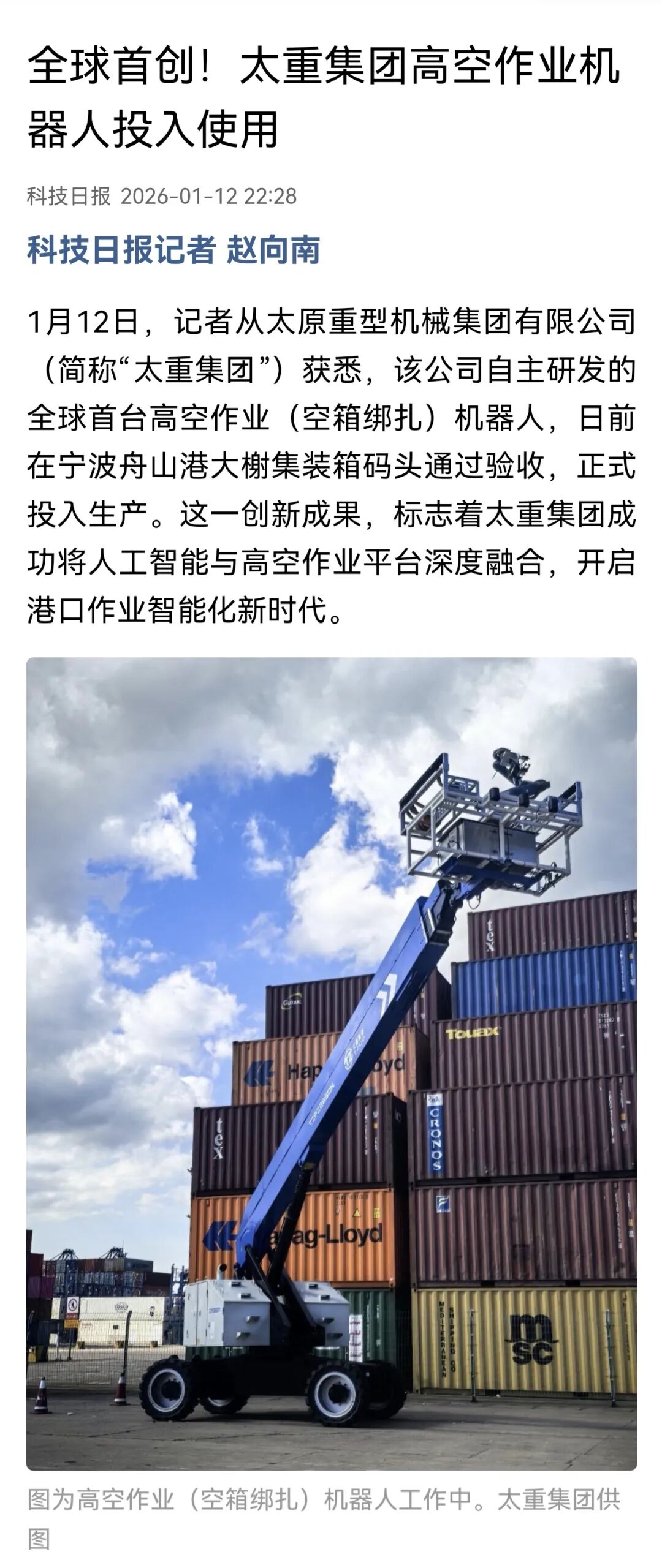 1月12日,记者从太原重型机械集团有限公司(简称“太重集团”)获悉,该公司自主研发的全球首台高空作业(空箱绑扎)机器人,日前在宁波舟山港大榭集装箱码头通过验收,正式投入生产。这一创新成果,标志着太重集团成功将人工智能与高空作业平台深度融合,开启港口作业智能化新时代。