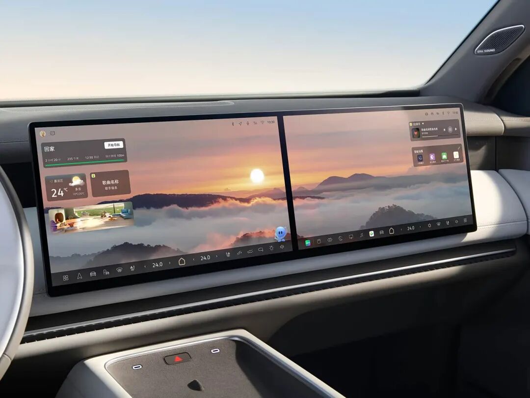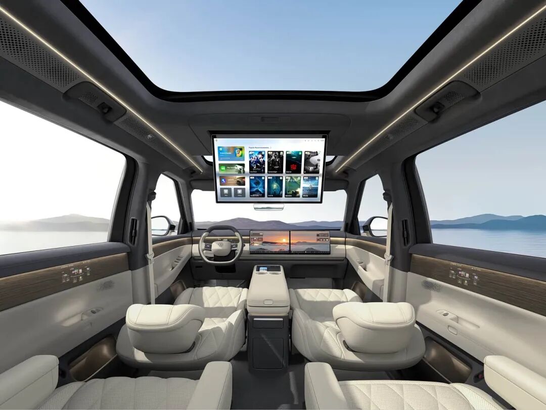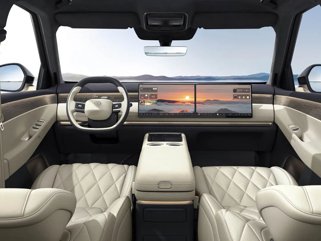 首先来看内饰,上汽大众ID. ERA 9X的内饰以方圆合蕴为核心设计理念,融合德系功能美学与东方空间哲学,采用一体环抱式座舱。中控台与门板采用立体解构、悬挑处理,浅色内饰基调(米白皮质+棕色木纹饰条)更显奢华,木纹从仪表台贯穿至ABC柱及第三排,营造高级感。主驾仪表与中控无缝衔接,配备15.6英寸中控主副驾双联屏以及21.4英寸后排可折叠吸顶大屏。